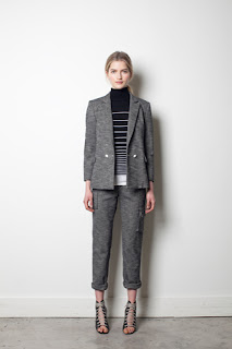 This new BOY. Pre-Fall 2012 Collection was just presented at their Broome St. studio in NYC. Scott took inspiration from the 1979 Woody Allen film Manhattan starring Diane Keaton as his style muse for the collection. It definitely has that BOY. feel throughout the collection and I love the green cord suit! The models feet are atrocious though! I am a foot person and her dogs need work. Anywho, the dress in pic 6 right underneath the green cord suit definitely sticks out from the rest as well as the peacoat with the huge white button. They brought back the bandage skirt this time in a burgundy and cream color combo and the last look in that navy suit with leather lapels and big BOY. logo sweater is my favorite.